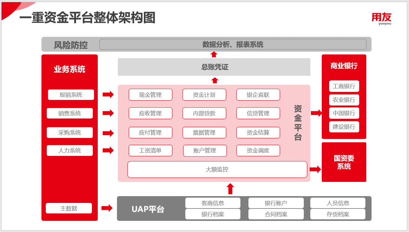 攜手用友打造資金平臺(tái),搭建資金集中監(jiān)控系統(tǒng),實(shí)行資金預(yù)算計(jì)劃管理,成立資金結(jié)算中心,將資金資源進(jìn)行集中管控,提升資金使用的安全性、收益性和效率性;打通與采購、銷售、報(bào)銷、人力系統(tǒng)的對接,實(shí)現(xiàn)數(shù)據(jù)不落地處理;應(yīng)用銀企直聯(lián),實(shí)現(xiàn)線上交易結(jié)算;應(yīng)用票據(jù)管理模塊,實(shí)現(xiàn)票據(jù)臺(tái)賬數(shù)字化;實(shí)現(xiàn)與國資委大額監(jiān)控系統(tǒng)的對接上報(bào);實(shí)現(xiàn)綜合資金數(shù)據(jù)提取和分析,為資金決策提供支撐。