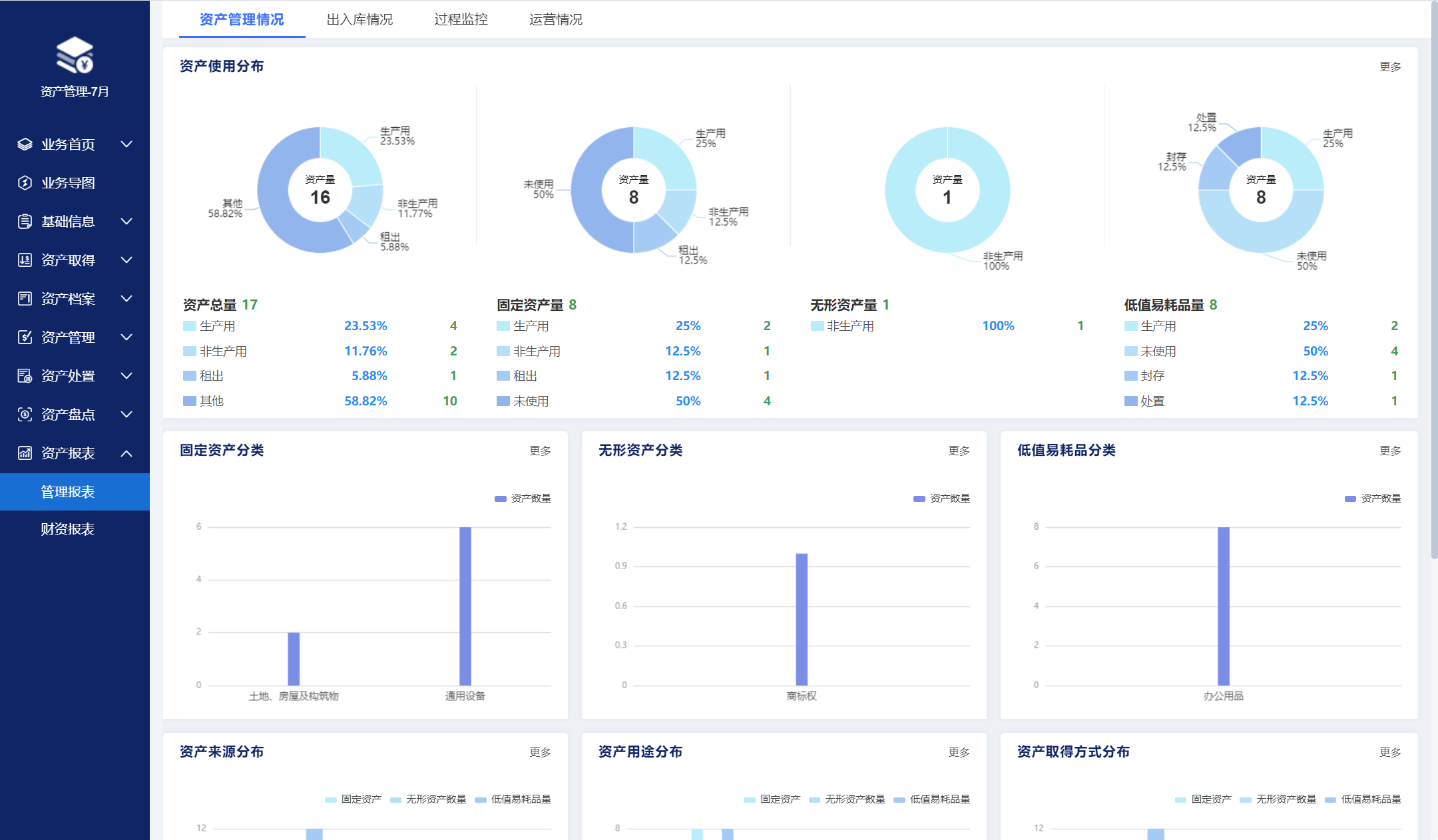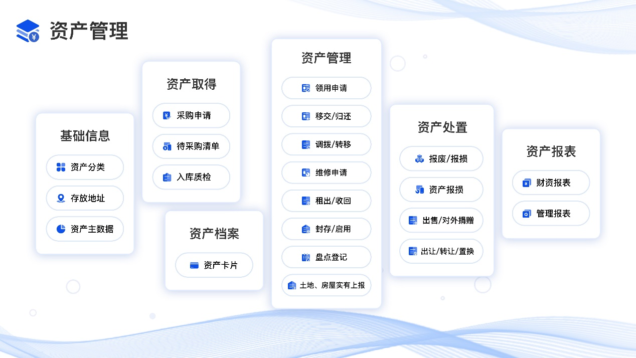 包含了對(duì)固定資產(chǎn)、無形資產(chǎn)、低值易耗品全量資產(chǎn),覆蓋資產(chǎn)分類、存放位置、主數(shù)據(jù)等基礎(chǔ)信息管理,以及從資產(chǎn)采購、入庫、領(lǐng)用、調(diào)撥、移交、歸還、盤點(diǎn)、處置等全生命周期流轉(zhuǎn)管理。
